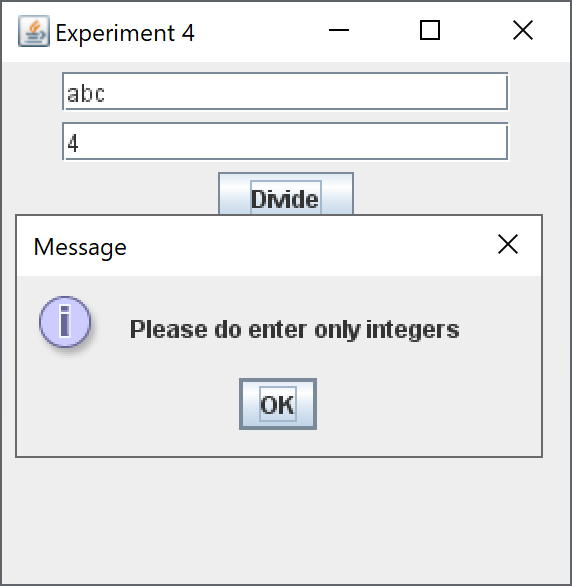 JOptionPane.showMessageDialog(actualWindow,"Please do enter only integers");